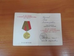 Удостоверение к медали "50 лет Победы в  Великой отечественной войне 1941-1945 г." П.А.Шулепова. Передано в дар от В.П.Ковалевой в 2018 году.