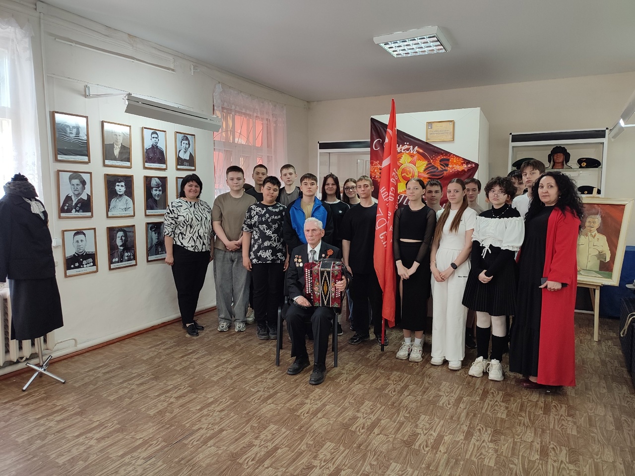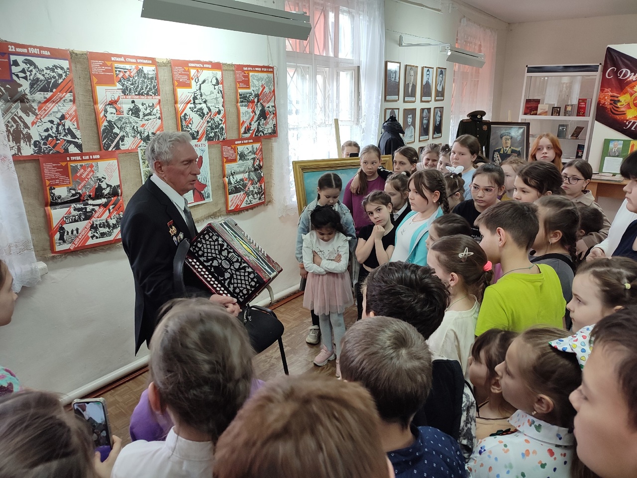 Совершенно справедливо сказал когда-то маршал Жуков: «Тыл – это половина Победы». Тот самый тыл, который обеспечивал фронт свинцом, углём, зимней одеждой, военными займами, хлебом, мясом. А сами питались чем придётся. Юрий Иванович поделился своими воспоминаниями о детстве, как его семья собрала средства на покупку самолета на фронт, о Победе, о послевоенном детстве, и о том, как работал инструктором-преподавателем в ДОСААФ. На встречу Юрий Иванович принес гармонь, которая сопровождала солдата, громила гитлеровцев даже в немецких генштабах. И спустя 80 лет военные песни любимы и трогают до глубины души, все присутствующие в этом убедились, когда Юрий Иванович заиграл знакомые мелодии «Катюши» и «Три танкиста», ребята с удовольствием подпевали.