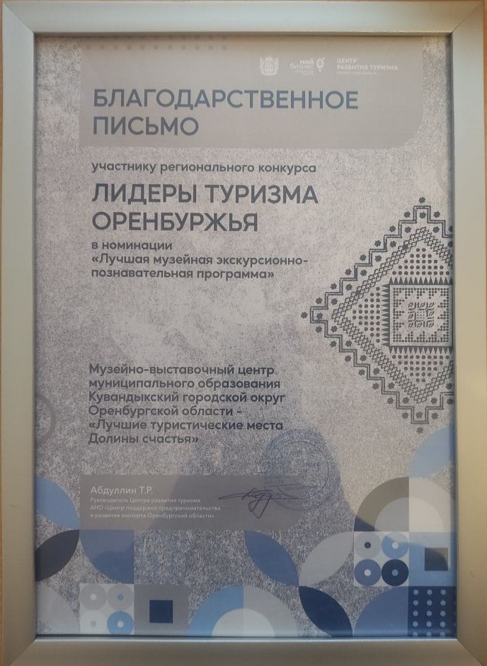 Кувандыкский Музейно-выставочный центр получил благодарственное письмо за участие в конкурсе «Лидеры туризма Оренбуржья» от Центра развития туризма АНО «Центр поддержки предпринимательства и развития экспорта Оренбургской области». Лучших определяли среди объектов туристической индустрии по 10 номинациям. Музейно-выставочный центр выступил в номинации «Лучшая музейная экскурсионно-познавательная программа в Оренбургской области» с проектом "Лучшие туристические места Долины счастья".