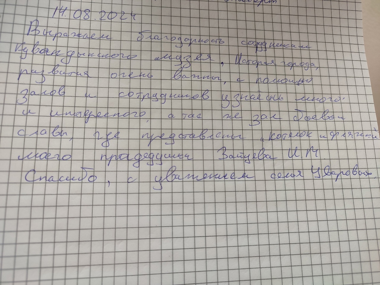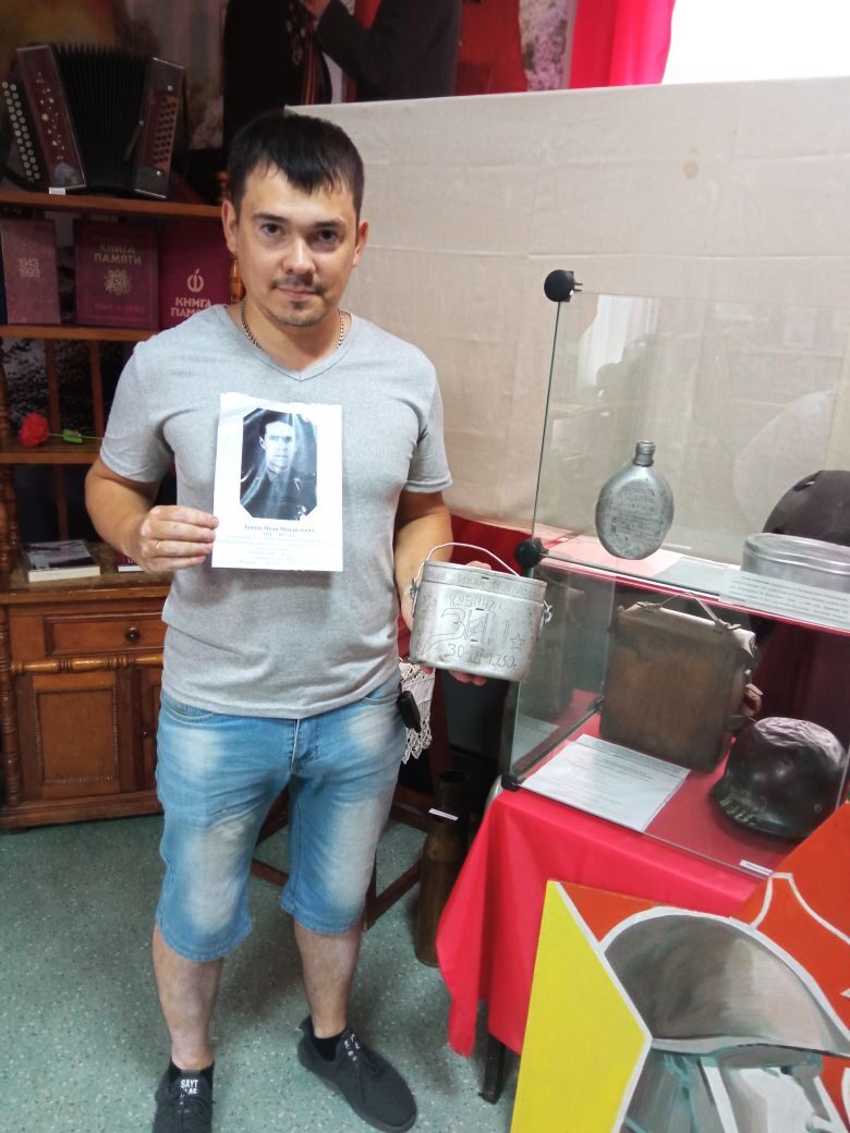 Сегодня, 14 августа Музейно-выставочный центр посетитил Евгений Уваров. Евгений является правнуком Зайцева Ивана Михайловича (участник Великой Отечественной войны 1941-145 гг.).В воинском зале музея хранятся фронтовые фляжка и котелок. При жизни Иван Михайлович мало что рассказывал о войне, но его солдатский котелок и фляжка - свидетели его боевого пути "Майкоп 1942, Кавказ, Крым, Украина, Кубань, Карпаты, Румыния - г. Штефанешты 15.04.1945".