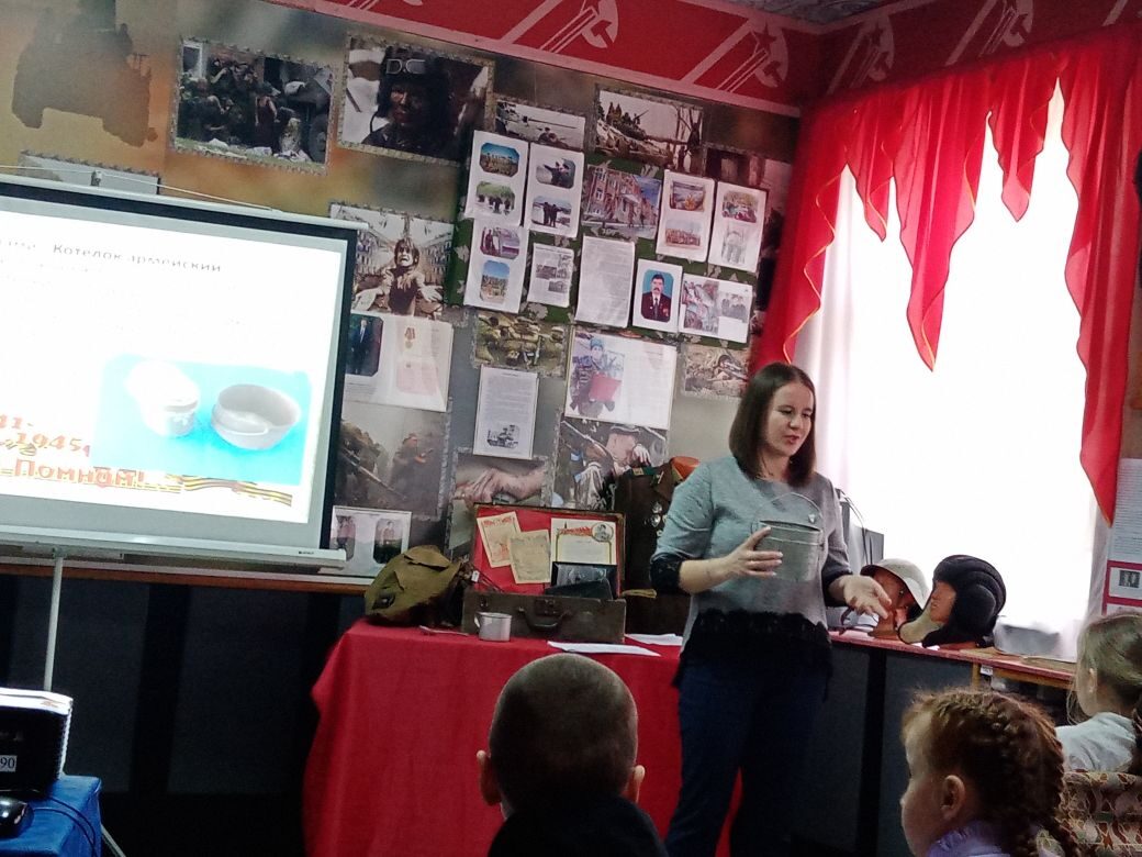 Рассматривая одежду красноармейцев — гимнастерку — ребята не только узнали название и историю появления этого предмета одежды, но и представили себе реальных людей, принимавших участие в боях. Не меньше внимания, при проведении занятия «Вещи, помнящие войну», уделялось бытовым предметам. Котелки и фляжки, планшет— предметы, назначение которых дети не всегда могут определить самостоятельно. Также внимательно учащиеся вслушивались в строки фронтовых писем сыновей к родителям, мужей и отцов — к своим женам и детям. С особым трепетом рассматривали игрушки военного детства. Какими они были? И какая у них история, судьба – об этом ребята также узнали в ходе занятия. Мероприятие было проведено в рамках культурно-образовательного проекта «Культура для школьников» для самых маленьких учащихся общеобразовательной школы №4.