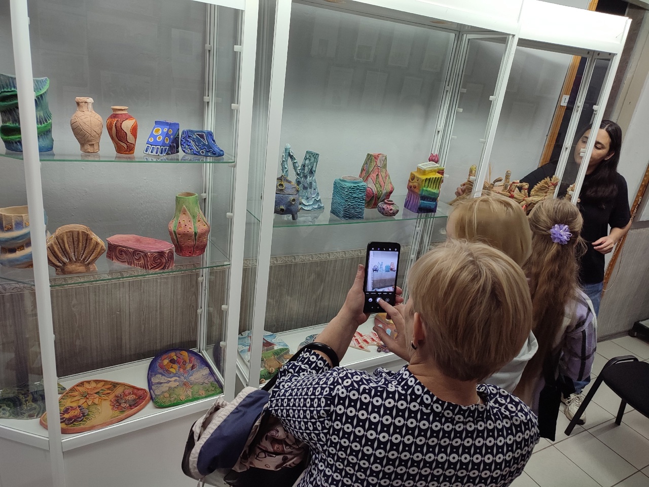 Экспозиция выставки свидетельствует о том, что преподаватели ДШИ стремятся раскрыть в учащихся высокий художественный потенциал, помочь ребёнку научиться наблюдать и познавать окружающий мир. Произведения декоративно-прикладного искусства – наиболее яркая часть творчества детей. Здесь керамика и батик, пластинография. Яркость, самобытность и новизна их исполнения свидетельствуют о серьёзном творческом погружении в мир изобразительного искусства педагогов и их учеников.