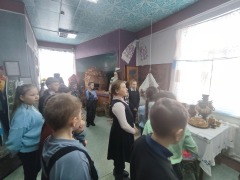 Знакомство с залам «Этнографии» в музейно-выставочном центре и основными понятиями теории этноса. Изучение культуры русского народа: национальные традиции, показ костюма, национальные игры: «Ручеек», «Злотые ворота», «Платочек», чтение национальной сказки «Чудесные лапоточки». Занятие проходило в зале "Этнографии", присутствовало 13 человек.