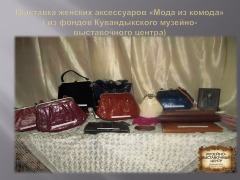 Кувандыкский музейно- выставочный центр предоставил передвижную выставку «Мода из комода» для Медногорского городского музея. Часть этой коллекции «История дамских сумочек» была представлена на Дорофеевских краеведческих чтениях в г.Оренбурге (Оренбургский Губернаторский историко-краеведческий музей). В Кувандыкском музейно - выставочном центре коллекция дамских аксессуаров собиралась давно и продолжает пополняться новыми экспонатами сегодня. На выставке представлены: сумочки, кошельки, шарфы, воротнички, броши и другие аксессуары. Особое место отведено сумочкам. Каждая из них имеет свою историю. Предметы этой коллекции, такие как сумочки, пользуется огромным интересом среди жительниц нашего города. Предметы выставки принадлежали жительницам нашего города. С трепетом и любовью хозяйки передавали свои аксессуары в наши фонды, дочери передают сумочки, платочки, шарфики и броши своих мам и бабушек в надежде, что здесь эти ценные для них предметы обретут второй дом. На выставке представлены сумочки 1950-1980-х годов, кошельки 1960-1980-хх годов, шарфики, головные и шейные платки. Большой интерес вызывают воротнички для украшения платья или блузки, все они принадлежали жительнице г. Кувандыка. Жабо — воротник, а развитию воротников мода обязана мужчинам. История этого элемента началась в Средние века с узкой полоски на мужской одежде. Бусы, броши, подвеска и серьги относятся к началу 1980-х годов, эти аксессуары так же носили модницы нашего города.