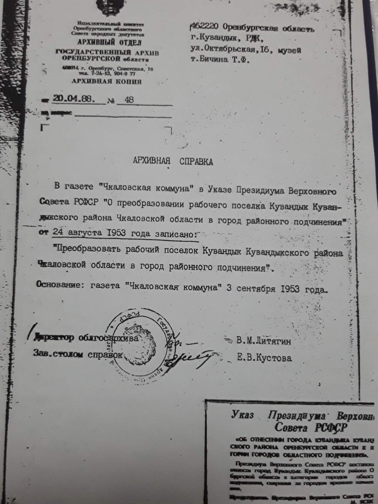 документ (копия) "О преобразовании рабочего поселка Кувандык Кувандыкского района Чкаловской области в город районного подчинения".24 августа 1953 г.