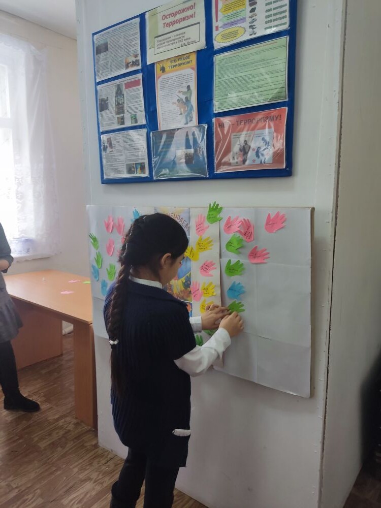 В музейно-выставочном центре для учащихся 3 класса СОШ №5 был проведен урок мира «Мы – против террора». В ходе беседы ребята узнали, что такое терроризм и методы его проявления. Юные посетители приняли участие в акции «Ладошки добра», на которой ребята разместили свою «ладошку добра» на планшете с детскими рисунками о мире и доброте со словами, которые у них ассоциируются с миром без терроризма.