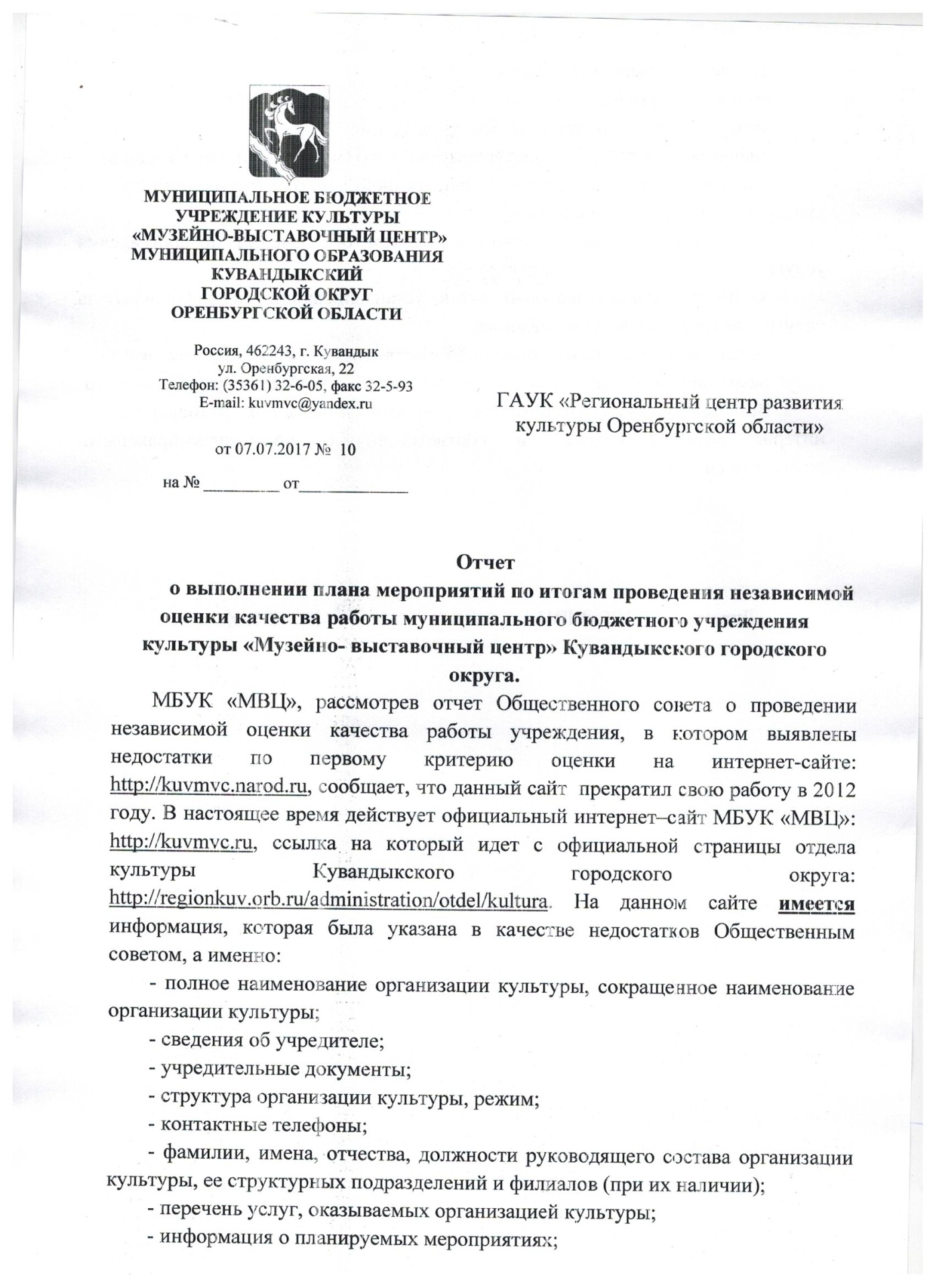 В соответствии с решением Общественного Совета независимая оценка качества работы муниципальных учреждений/организаций Оренбургской области, оказывающих услуги в сфере культуры была проведена в Муниципальном бюджетном учреждении культуры «Музейно-выставочный центр» Кувандыкского городского округа.
